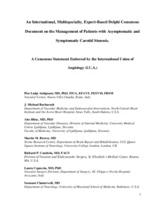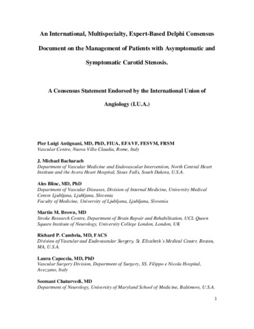 Title: | An international, multispecialty, expert-based Delphi Consensus document on controversial issues in the management of patients with asymptomatic and symptomatic carotid stenosis |