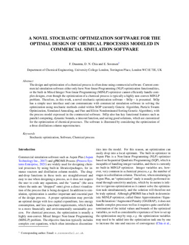 | Title: | A novel stochastic optimization software for the optimal design of chemical processes modeled in commercial simulation software |