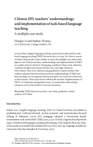 Title: | Chinese EFL teachers’ understandings and implementation of task-based language teaching |