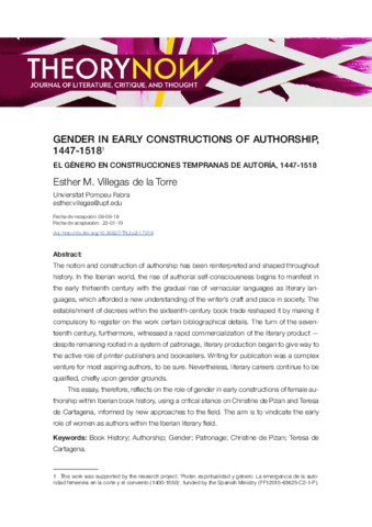 The notion and construction of authorship has been reinterpreted and shaped throughout history. In the Iberian world, the rise of authorial self-consciousness begins to manifest in the early thirteenth century, thanks to the gradual rise of vernacular languages as literary languages, which afforded a new understanding of the writer’s craft and place in society. The establishment of decrees within the sixteenth-century book trade reshaped it by making it compulsory to register on the work certain bibliographical details. The turn of the seventeenth century, furthermore, witnessed a rapid commercialization of the literary product — despite remaining rooted in a system of patronage, literary production began to give way to the active role of printer-publishers and booksellers. Writing for publication was a complex venture for most aspiring authors, to be sure. Nevertheless, pre-modern literary careers continue to be qualified, chiefly upon gender grounds. This essay, therefore, will reflect on the role of gender in early constructions of female authorship within Iberian book history, using a critical stance informed by new approaches to the field. It is hoped that it will help to provoke more nuanced discussions on the role of women as cultural producers within the pre-modern Iberian literary field. // La noción y construcción de autoría ha sido reinterpretada y moldeada a través de la historia. En el mundo ibérico, el surgimiento de la conciencia autorial comienza a manifestarse a principios del siglo XIII por la elevación de las lenguas vernáculas como lenguas literarias, que hizo posible un nuevo discurso sobre el quehacer literario y su lugar en la sociedad. El establecimiento de decretos dentro del mercado libresco del siglo XVI la remodeló al hacer obligatorio el registro de ciertos datos bibliográficos en la obra misma. El siglo XVII, asimismo, fue testigo de la rápida comercialización del producto literario — los impresores-editores y vendedores de libros comenzaron a asumir un papel más activo en la producción literaria, pese a seguir arraigada al sistema de mecenazgo. Escribir para la publicación, sin duda, constituía una operación compleja para muchos. No obstante, la carrera del autor pre-moderno suele calificarse, generalmente, por razones de género. Este ensayo reflexiona sobre el papel del género en construcciones tempranas de autoría femenina dentro de la historia del libro ibérico, usando para ello nuevos enfoques con Christine de Pizan y Teresa de Cartagena. El objetivo es reivindicar el temprano estatus de la mujer como autora en el campo literario ibérico.