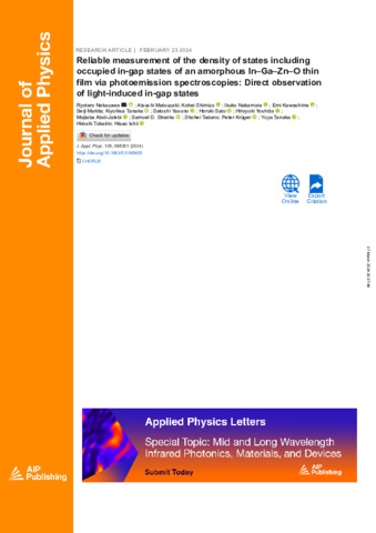 | Title: | Reliable measurement of the density of states including occupied in-gap states of an amorphous In-Ga-Zn-O thin film via photoemission spectroscopies: Direct observation of light-induced in-gap states |