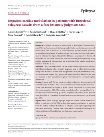 Title: | Impaired cardiac modulation in patients with functional seizures: Results from a face intensity judgment task |