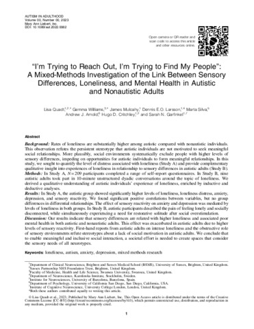 Title: | ‘‘I’m Trying to Reach Out, I’m Trying to Find My People’’: A Mixed-Methods Investigation of the Link Between Sensory Differences, Loneliness, and Mental Health in Autistic and Nonautistic Adults |
