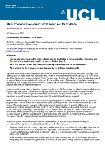 Title: | UK international development white paper: call for evidence. Response from UCL Institute for Sustainable Resources |