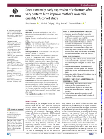 Title: | Does extremely early expression of colostrum after very preterm birth improve mother’s own milk quantity? A cohort study |