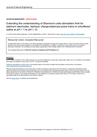 | Title: | Extending the understanding of Shannon's safe stimulation limit for platinum electrodes: biphasic charge-balanced pulse trains in unbuffered saline at pH = 1 to pH = 12 |