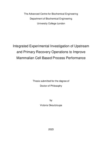 Title: | Integrated Experimental Investigation of Upstream and Primary Recovery Operations to Improve Mammalian Cell Based Process Performance |