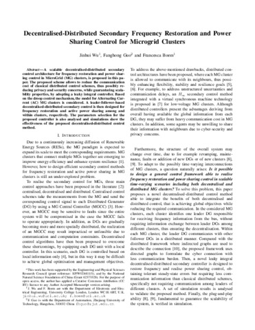 Decentralised-Distributed Secondary Frequency Restoration and Power Sharing Control for Microgrid Clusters.