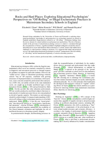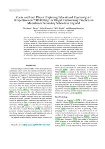 Title: | Rocks and Hard Places: Exploring Educational Psychologists’ Perspectives on “Off-Rolling” or Illegal Exclusionary Practices in Mainstream Secondary Schools in England |