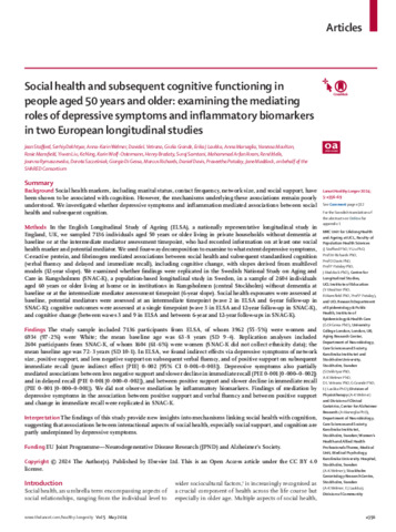 Title: | Social health and subsequent cognitive functioning in people aged 50 years and older: examining the mediating roles of depressive symptoms and inflammatory biomarkers in two European longitudinal studies |
