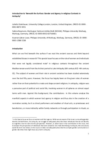 Title: | Introduction to ‘Beneath the Surface: Gender and Agency in Religious Contexts in Antiquity’ |