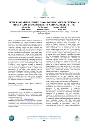 Title: | Effects of Visual Stimulus on Soundscape Perception: A Pilot Study Using Immersive Virtual Reality (IVR) |