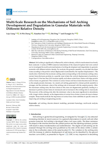 | Keywords: | Soil arching; discrete element modeling; persistent homology; multi-scale analysis; relative density |