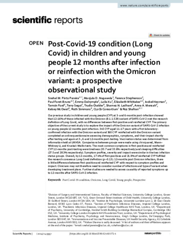 | Title: | Post-Covid-19 condition (Long Covid) in children and young people 12 months after infection or reinfection with the Omicron variant: a prospective observational study |