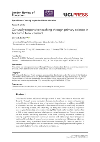 | Title: | Culturally responsive teaching through primary science in Aotearoa New Zealand |