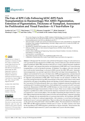 Title: | The Fate of RPE Cells Following hESC-RPE Patch Transplantation in Haemorrhagic Wet AMD: Pigmentation, Extension of Pigmentation, Thickness of Transplant, Assessment for Proliferation and Visual Function—A 5 Year-Follow Up |