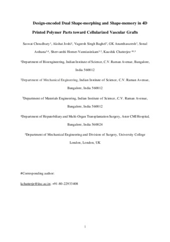 Title: | Design-encoded dual shape-morphing and shape-memory in 4D printed polymer parts toward cellularized vascular grafts |