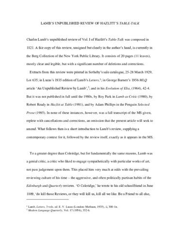 Title: | Lamb's Unpublished Review of Hazlitt's Table-Talk |
