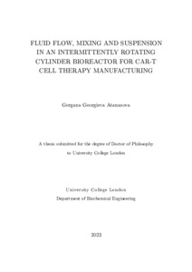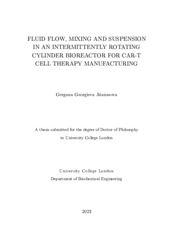 | Title: | Fluid flow, mixing and suspension in an intermittently rotating cylinder bioreactor for CAR-T cell therapy manufacturing |