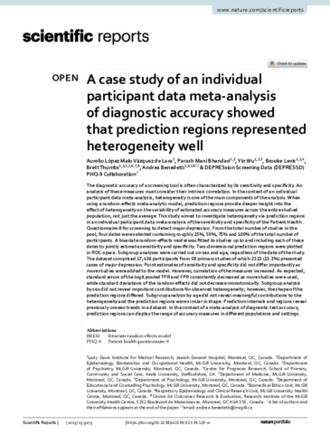 The diagnostic accuracy of a screening tool is often characterized by its sensitivity and specificity. An analysis of these measures must consider their intrinsic correlation. In the context of an individual participant data meta-analysis, heterogeneity is one of the main components of the analysis. When using a random-effects meta-analytic model, prediction regions provide deeper insight into the effect of heterogeneity on the variability of estimated accuracy measures across the entire studied population, not just the average. This study aimed to investigate heterogeneity via prediction regions in an individual participant data meta-analysis of the sensitivity and specificity of the Patient Health Questionnaire-9 for screening to detect major depression. From the total number of studies in the pool, four dates were selected containing roughly 25%, 50%, 75% and 100% of the total number of participants. A bivariate random-effects model was fitted to studies up to and including each of these dates to jointly estimate sensitivity and specificity. Two-dimensional prediction regions were plotted in ROC-space. Subgroup analyses were carried out on sex and age, regardless of the date of the study. The dataset comprised 17,436 participants from 58 primary studies of which 2322 (13.3%) presented cases of major depression. Point estimates of sensitivity and specificity did not differ importantly as more studies were added to the model. However, correlation of the measures increased. As expected, standard errors of the logit pooled TPR and FPR consistently decreased as more studies were used, while standard deviations of the random-effects did not decrease monotonically. Subgroup analysis by sex did not reveal important contributions for observed heterogeneity; however, the shape of the prediction regions differed. Subgroup analysis by age did not reveal meaningful contributions to the heterogeneity and the prediction regions were similar in shape. Prediction intervals and regions reveal previously unseen trends in a dataset. In the context of a meta-analysis of diagnostic test accuracy, prediction regions can display the range of accuracy measures in different populations and settings.