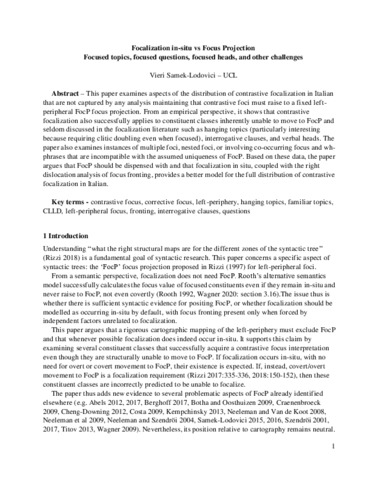 Title: | Focalization in-situ vs focus projection: Focused topics, focused questions, focused heads, and other challenges |