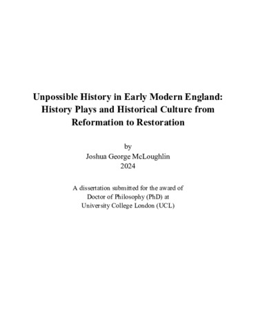 This thesis offers the first account of the origins, significance, and ramifications of ‘unpossible history’ in early modern English historical culture, from the Henrician Reformation to the Restoration, with a particular focus on historical drama. I coin the term ‘unpossible history’ to group historians and dramatists including John Bale, John Foxe, Raphael Holinshed, Abraham Fleming, Samuel Rowley, Edward Herbert, John Crouch, Samuel Sheppard, Thomas May, John Rushworth, Thomas Fuller, Lucy Hutchinson, Margaret Cavendish and others who made the ‘toile’ of history the subject of historical representation and raised doubts about the possibility of historical consensus. I trace the origins of unpossible history to the breakdown of historical consensus in the Henrician Reformation and demonstrate the significance of unpossible history by showing that it recurs at key moments in English historical culture and provides a framework for interpreting many forms of history. Each chapter centres around historical drama because it was an especially prominent point of exchange between different historical sources, forms and genres. My study examines the ramifications of unpossible history by demonstrating its continuing influence on historical culture in the late seventeenth century. In doing so, this thesis makes original contributions to two fields: the ‘history of history’ and scholarship on historical drama. The thesis revises scholarly assumptions in the ‘history of history’ that the Civil War marked the collapse of consensus in English historiography, arguing instead that the Henrician Reformation unleashed a wave of self-conscious doubt about the possibility of historical consensus. It gives a new interpretation of the significance of early modern historical drama, showing how history plays, from the 1530s to the mid-seventeenth century, are not just plays of history but also plays about history, in which history – its forms, its media, its transmission, its possibilities and impossibilities – is at stake. In so doing, I show that one way of understanding history in early modern England – as a ‘mirror’ of the political present – has dominated scholarship on historical drama. By contrast, this study examines early modern forms of history alongside the sources and genres from which they adapted not only content but also their ‘protocols’ and ‘strategies of historical interpretation’. It restores historical drama and other imaginative genres to the ‘history of history’ and emphasises the importance of historical culture to our understanding of early modern literature.