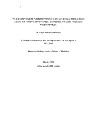 Title: | An exploratory study to investigate Inflammation and Cough in paediatric and adult patients with Primary Ciliary Dyskinesia, a comparison with Cystic Fibrosis and Healthy individuals |