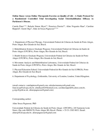 Title: | Online dance versus online therapeutic exercise on quality of life - a study protocol for a randomized controlled trial investigating social telerehabilitation efficacy in Parkinson disease |
