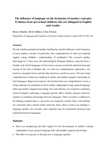 | Title: | The influence of language on the formation of number concepts: evidence from preschool children who are bilingual in English and Arabic |