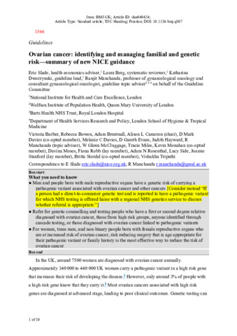 | Title: | Ovarian cancer: Identifying and managing familial and genetic risk - Summary of new NICE guidance |