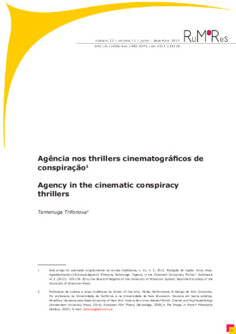 Os thrillers de conspiração contribuem para a negação da agência na cultura contemporânea, deixando assim a paranoia como a “estrutura de sentimento” dominante? São esses filmes supersimplificações irracionais ou conseguem chamar atenção para as complexidades da nova ordem mundial? Este artigo examina as mudanças de representação da agência nos recentes thrillers de conspiração. O argumento aqui utilizado é que os thrillers de conspiração contemporâneos apontam para um crescimento da incerteza sobre questões de causalidade, responsabilidade e agência, e para a rotinização da conspiração.
