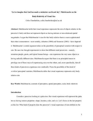 Title: | ‘Let us imagine that God has made a miniature earth and sky’: Malebranche on the Body-Relativity of Visual Size |
