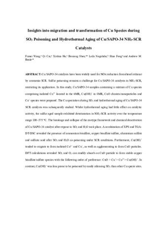 | Title: | Insights into Migration and Transformation of Cu Species during SO2 Poisoning and Hydrothermal Aging of Cu/SAPO-34 NH3–SCR Catalysts |