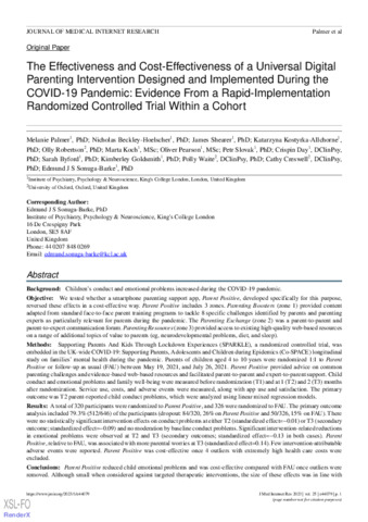 Title: | The Effectiveness and Cost-Effectiveness of a Universal Digital Parenting Intervention Designed and Implemented During the COVID-19 Pandemic: Evidence From a Rapid-Implementation Randomized Controlled Trial Within a Cohort |