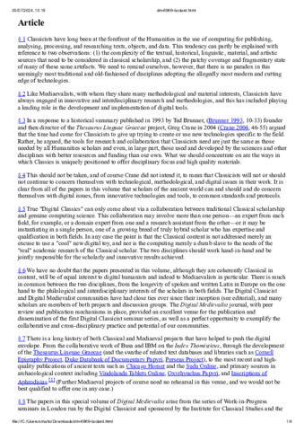 Classicists have long been at the forefront of the Digital Humanities. As is also true in mediaeval studies, this engagement with technology is due primarily to the complexity of the primary sources under consideration and patchy and often fragmentary state of these same artefacts. The papers in this collaborative issue of Digital Medievalist continue this tradition of cutting edge technological and disciplinary work. Drawing from papers presented at the inaugural Digital Classicist Work-in-Progress seminar series in London in the Summer of 2006 and adding other specially commissioned papers, this issue provides an in-depth view of current research in many of the most important areas in the Digital Classics: text markup and electronic publication; geotagging and network analysis; semantic web/social networking technologies; visualization and relational database tools. While the papers are all written with a disciplinary focus on the Classics, the research they discuss is of obvious interest to mediaevalists, and those working in the Digital Humanities more generally.