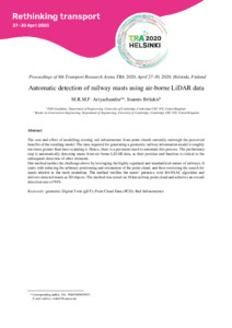 The cost and effort of modelling existing rail infrastructure from point clouds currently outweigh the perceived benefits of the resulting model. The time required for generating a geometric railway information model is roughly ten times greater than laser scanning it. Hence, there is a persistent need to automate this process. The preliminary step is automatically detecting masts from air-borne LiDAR data, as their position and function is critical to the subsequent detection of other elements. Our method tackles the challenge above by leveraging the highly regulated and standardized nature of railways. It starts with reducing the arbitrary positioning and orientation of the point cloud; and then restricting the search for masts relative to the track centerline. The method verifies the masts’ presence with RANSAC algorithm and delivers detected masts as 3D objects. The method was tested on 18 km railway point cloud and achieves an overall detection rate of 94%.