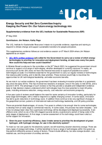 Title: | Keeping the Power On: Our future energy technology mix. Energy Security and Net Zero Committee Inquiry - supplementary evidence |