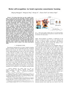 To develop robots that can show cognitive functions, we must learn from the knowledge of human cognition. Existing biological and psychological evidence suggests that self-face perception and sensorimotor learning mechanisms play a crucial role in self-recognition. However, one of the most important self-identity cues – facial information – has not been extensively studied in the robot self-recognition task. Current research on robot self-recognition primarily relies on the recognition of high-precision targets and tracking of manipulator motions, where the self-perception of facial information is not well studied. In this work, we propose a novel approach to achieve self-recognition via self-perception of facial expressions. Specifically, we developed a Conditional Generative Adversarial Network (CGAN) model using the knowledge on human cognitive and sensorimotor functions. It allows the robot to be aware of self-face (i.e., off-line model). Passing the observed visual variations in a mirror and comparing them to self-perceptive information, the robot can recognize the self through an online Bayesian learning regression. The results of our first experiment show that the robot can recognize itself in a mirror. The results from the second experiment show that our algorithm could be tricked by a similar robot with the same facial expressions, which is similar to the rubber hand illusion (RHI).