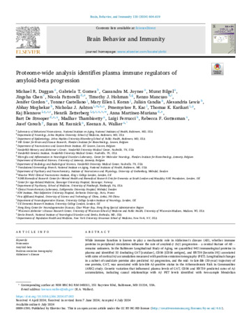 Proteome-wide analysis identifies plasma immune regulators of amyloid-beta progression.