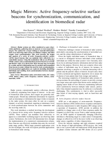 Magic Mirrors: Active Frequency-Selective Surface Beacons for Synchronization, Communication, and Identification in Biomedical Radar.