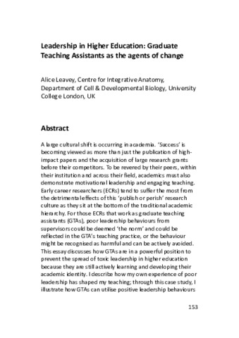 A large cultural shift is occurring in academia. ‘Success’ is becoming viewed as more than just the publication of high-impact papers and the acquisition of large research grants before their competitors. To be revered by their peers, within their institution and across their field, academics must also demonstrate motivational leadership and engaging teaching. Early career researchers (ECRs) tend to suffer the most from the detrimental effects of this ‘publish or perish’ research culture as they sit at the bottom of the traditional academic hierarchy. For those ECRs that work as graduate teaching assistants (GTAs), poor leadership behaviours from supervisors could be deemed ‘the norm’ and could be reflected in the GTA’s teaching practice, or the behaviour might be recognised as harmful and can be actively avoided. This essay discusses how GTAs are in a powerful position to prevent the spread of toxic leadership in higher education because they are still actively learning and developing their academic identity. I describe how my own experience of poor leadership has shaped my teaching; through this case study, I illustrate how GTAs can utilise positive leadership behaviours to improve the student experience. Future directions for how institutions can facilitate leadership development through training initiatives early in the academic career path are also discussed.