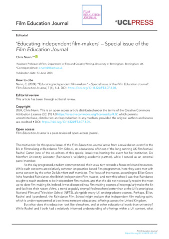 Title: | ‘Educating independent film-makers’ – Special issue of the Film Education Journal |