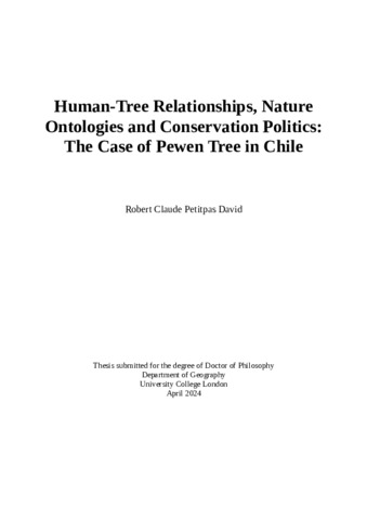 This PhD explores the politics of pewen tree (Araucaria araucana) conservation in Chile and how these are shaped by different understandings of nature and human-nature relations. Embedded within the political ecology of conservation and informed by relational approaches from environmental humanities and ontological politics, the thesis explores these debates through an in-depth example from a less widely researched field, namely tree conservation. Pewen is an iconic tree in Chile, with the highest level of legal protection. It is present in the temperate rain forest of Southern Chile and Argentina, and it can reach 50 meters high and more than 1000 years old. For Pewenche indigenous peoples, pewen is a sacred tree and a basic means of subsistence, mainly, but not only, because of its nutritious seeds (i.e. piñones). The research is based on qualitative methods: interviews with government officials, ecologists, geneticists, and Pewenche; participatory observation in workshops and meetings; field visits to pewen forests with relevant actors; and a review of policy documents, public letters and newspapers. Fieldwork was conducted between 2017 and 2018, when two key events took place: the national reclassification of pewen conservation status and the start of the Pewen National Conservation Plan. The analysis unfolds through three sections. First, it explores the politics of pewen reclassification demonstrating how the process was shaped by cultural and political meanings ascribed to species status in the assessments. Second, it explores the relationships between Pewenche and pewen as a process of becoming-with, showing how a local pewen ontology is enacted from the interaction between Pewenche and pewen in ways that challenges dominant conservation dichotomies. Third, it develops an analysis of the ways in which different human-nature relations shape pewen conservation, comparing three approaches to this (ecologists, geneticists and Pewenche) and examining how these are embedded in unequal power relations.