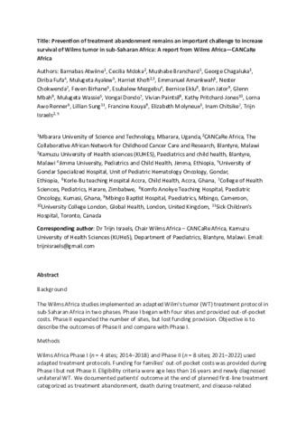 Title: | Prevention of treatment abandonment remains an important challenge to increase survival of Wilms tumor in sub-Saharan Africa: A report from Wilms Africa-CANCaRe Africa |