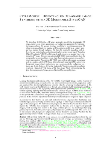 Title: | StyleMorph: Disentangled 3D-Aware Image Synthesis with a 3D Morphable StyleGAN |