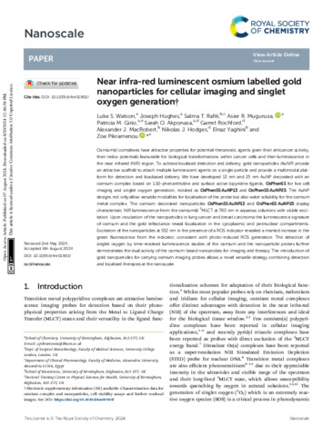 Title: | Near Infra-Red Luminescent Osmium Labelled Gold Nanoparticles for Cellular Imaging and Singlet Oxygen Generation |