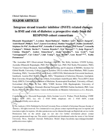 Title: | Integrase Strand Transfer Inhibitor–Related Changes in Body Mass Index and Risk of Diabetes: A Prospective Study From the RESPOND Cohort Consortium |