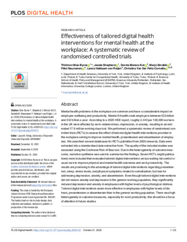 Title: | Effectiveness of tailored digital health interventions for mental health at the workplace: A systematic review of randomised controlled trials |