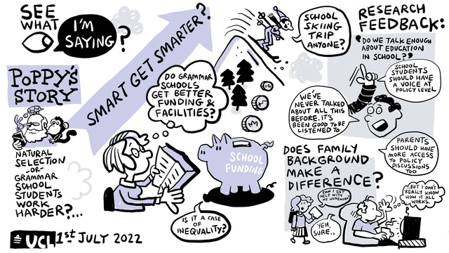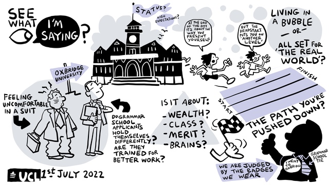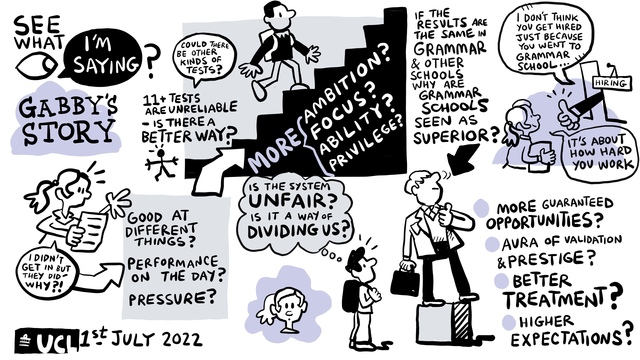 Dr Francesca McCarthy led a workshop discussion with eight pupils who attend a non-academically selective secondary school in an academically selective area. The discussion was prompted by stories that had been shared with me by participants in my earlier research. The pupils taking part in ‘See What I’m Saying?’ shared their reflections on the issues raised by the stories which were then live drawn by the artist Josh Knowles. This collaboration resulted in the following illustrations, which provide a visual representation of the pupils’ reflections on academically selective education.