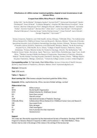 Title: | Effectiveness of a Wilms tumour treatment guideline adapted to local circumstances in sub-Saharan Africa: A report from Wilms Africa Phase II—CANCaRe Africa |